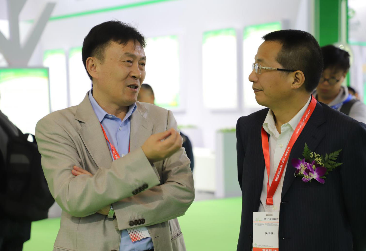 展臺上薛總與農業部農藥檢定所黨委書記吳國強親切交談