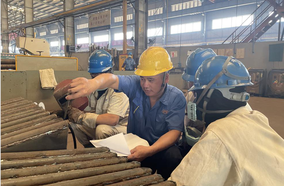 金通靈,一個有著深厚歷史底蘊的企業,是孕育勞模的沃土,多年來,培養出3名省勞動模范,6名市勞動模范,1名區勞動模范,2018年6月,金通靈成立了勞模集群黨支部,充分發揮勞模示范效應,引領產業工人加入到創新驅動發展的行列,助力企業發展。尹芬興便是勞動模范中的代表人物,今年他被評為“江蘇省勞動模范”,年近五十的他已在金通靈走過26年的青春歲月。當年尹芬興從安徽老家出來時,他還不到20歲,憑著一腔熱血和對未來美好的憧憬來到南通工作。他把勞動當做樂趣,跟同事們交流經驗、切磋手藝,共同解決工作中遇到的難題是他工作的常態。26年來,他不斷摸索,不斷學習,不斷提升,積極發揮勞模示范帶頭作用,帶領團隊成員積極投身到創新工作中,多年來攻克多個技術難題。其中“兩節身”前盤的成型技術,低溫升蒸汽壓縮機組合成型免加工藝加強圈技術,干熄焦煤氣風機制作工藝改進等創新成果不僅節約了大量生產成本、縮短生產時間,更保證了產品質量,為公司創造了巨大經濟效益。如今的尹芬興是葉輪成型組一組組長,每日負責的事情繁雜,他卻總能一絲不茍地完成,臟活、累活搶著干,白色工作服印著他斑斑勞動的印記,也承載了他一路奮斗的榮光。26年來,他始終把“愛一行、干一行、專一行”作為工作的信條,以此激勵自己在工作崗位上奮發成才。就是憑著這樣的信念,他在一線崗位上堅守了二十余年,用堅持堅毅的姿態詮釋著勞模精神,讓勞模精神發光發熱。今年,尹芬興光榮地加入中國共產黨,高舉右拳,在黨旗下莊嚴宣誓,他黝黑發亮的面龐上印刻著堅定的信仰,從此,懷揣著共產黨人的初心使命,他又踏上了新的征途。