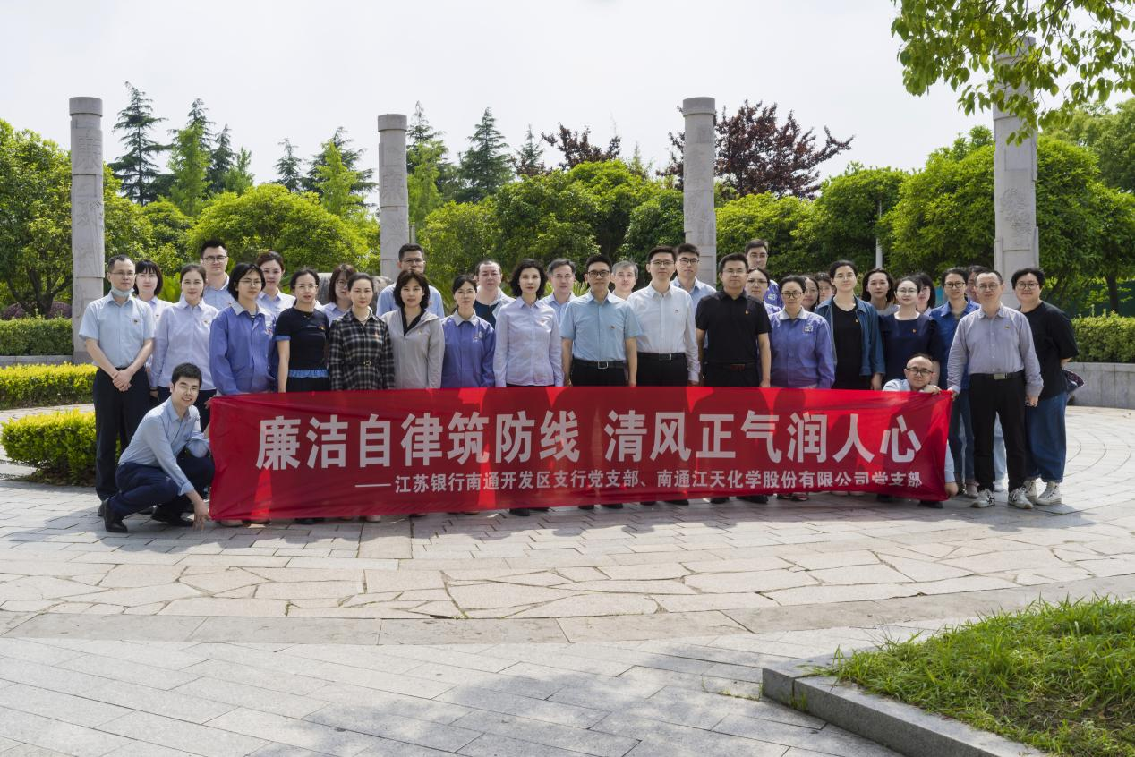 5月22日下午,江天化學黨支部與江蘇銀行南通開發區支行黨支部攜手共赴南通廉潔文化廣場,開展“廉潔自律筑防線 清風正氣潤人心”主題黨日共建活動。江天化學支部書記、副總經理張永鋒,支部副書記、副總經理沙曉東,支部委員、副總經理史彬,江蘇銀行南通開發區支行黨支部書記、行長孫晴等出席活動。